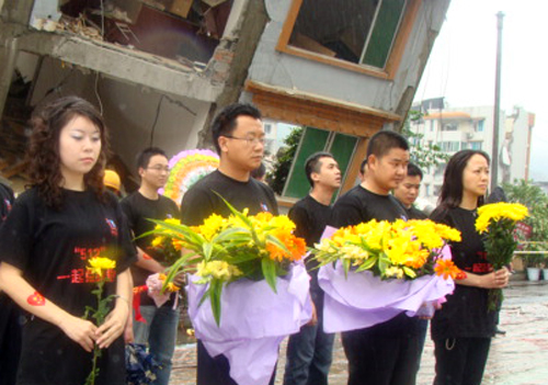 5月7日,红世公司员工在董事长周红、总经理谢德智的带领下,奔赴北川深切悼念“5?12”特大地震的遇难同胞。