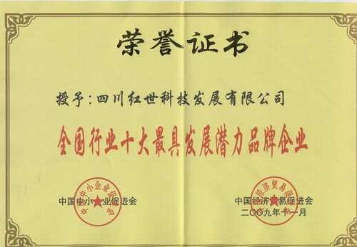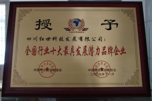 我公司——四川红世科技发展有限公司同时被授予“全国行业十大最具发展潜力品牌企业”荣誉称号。