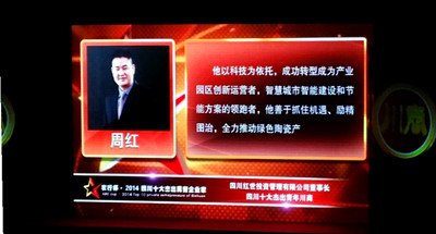 红世控股董事长周红先生获得“2014四川杰出民营企业家经营创新奖”,颁奖典礼现场高潮迭起,获奖企业家在热烈的掌声中走上领奖台,领取了这一铭刻着荣耀与辉煌的奖项。